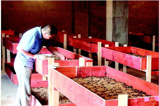 引進(jìn)土元后,張德星按照所學(xué)的飼養(yǎng)辦法把鋸未、黃土、草木灰按5:1:0.01的比例制成飼養(yǎng)土,然后放在自制的內(nèi)壁光滑的雙層長(zhǎng)方形木框內(nèi),每個(gè)框內(nèi)放置4公斤種卵、2公斤飼養(yǎng)土,溫度控制在40℃左右,經(jīng)過近30天的精心管理,幼蟲終于破殼出生,為此,張德星高興了幾天。