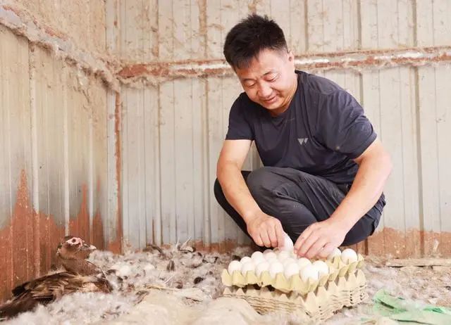 ↑6月18日,在廣宗縣核桃園鎮(zhèn)小辛莊村,飼養(yǎng)人員在撿拾非洲雁蛋。