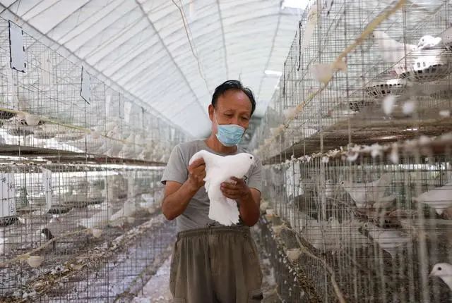 ↑6月18日,在廣宗縣核桃園鎮(zhèn)柏城村,飼養(yǎng)人員在查看肉鴿生長情況。