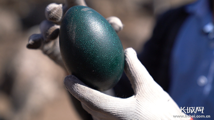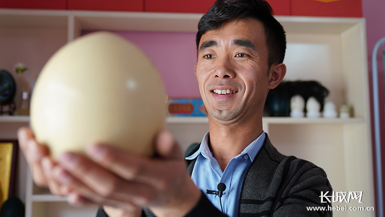鴕鳥養(yǎng)殖專業(yè)戶張清峰看著鴕鳥蛋滿心歡喜。長城網(wǎng)記者 馮碩 攝