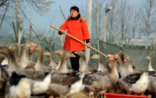 2014年3月28日,房小娜在大雁養(yǎng)殖場里給大雁喂食。今年29歲的房小娜2009年從淮北職業(yè)技術(shù)學(xué)院畢業(yè),2011年,在外打工的房小娜回到安徽五河縣,在沱湖邊創(chuàng)辦了大雁養(yǎng)殖專業(yè)合作社,在育苗、飼養(yǎng)、防疫、銷售等方面從零開始學(xué)習(xí)。如今,房小娜的大雁養(yǎng)殖已經(jīng)初具規(guī)模,在全國建立了30多家聯(lián)營商戶。