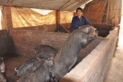 該村村民呂百景于2009年春用3000元從靳村鄉(xiāng)買回了3頭野豬崽,一公兩母。呂百景和妻子天天給這些野豬喂酒糟加雜糧的飼料,還到附近的山上割草讓野豬吃。在他們夫妻的精心喂養(yǎng)下,這些野豬生長得很快,野性也小了許多。半多年后,這些野豬開始繁殖。根據(jù)呂百景的觀察,野豬下的崽比家豬下的崽成活率高,于是,他就讓野豬和家豬雜交,繁衍了成活率高、抗病力強、長得快、又少了許多野性的后代。