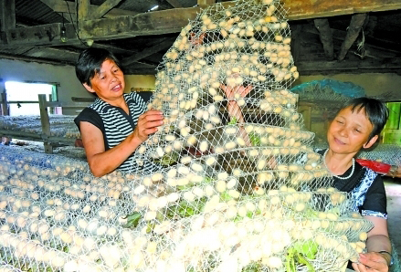 田時銘介紹,根據(jù)兩年的實踐,一張彩蠶可以讓農(nóng)戶增收200至300元,2012年,銅梁總結(jié)了上年成功試養(yǎng)的經(jīng)驗后,選定在養(yǎng)蠶基礎(chǔ)條件好的圍龍鎮(zhèn)和少云鎮(zhèn),發(fā)種30張,實行訂單收購。圍龍鎮(zhèn)村民羅印書養(yǎng)了2張彩繭蠶,采摘繭子80多公斤,賣了3500元。“我家前兩年養(yǎng)彩色蠶嘗到了甜頭,今年第二季還要繼續(xù)養(yǎng)彩色蠶。”
