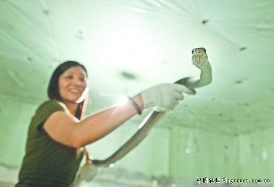來(lái)到養(yǎng)蛇場(chǎng),當(dāng)周平推開(kāi)兩道緊閉的門(mén)后,一股帶腥味的熱浪撲面而來(lái)。眼鏡蛇的房間用大約1米高的墻隔成了很多個(gè)小隔間。借著電筒光,記者看到了發(fā)出“呼呼”聲的眼鏡蛇,它們“蹭”地直起身子,一副再靠近就要發(fā)動(dòng)攻擊的樣子。楊靜這位“80后”女孩徒手抓起一條眼鏡蛇。眼鏡蛇在她手里滑動(dòng)。她很淡定地說(shuō),和這些蛇都比較熟悉了,抓蛇要有技巧,盡量讓蛇不感到威脅。