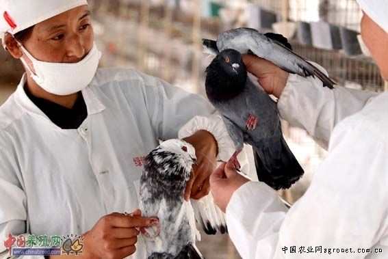 日前,養(yǎng)殖場的工人在為肉鴿進行常規(guī)"體檢"。