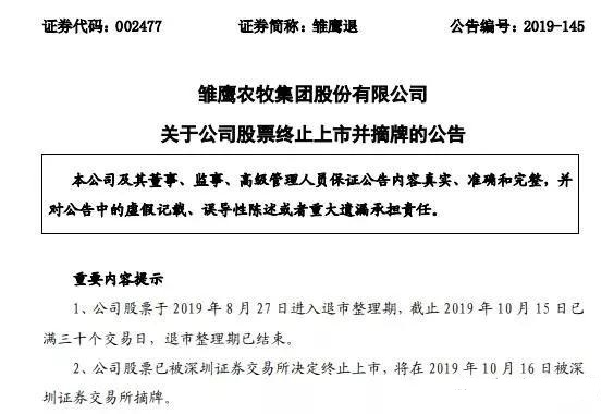 2019年10月15日是雛鷹農(nóng)牧集團(tuán)股份有限公司(002477,下稱“雛鷹農(nóng)牧”)退市整理期最后一個(gè)交易日。10月15日晚間,雛鷹農(nóng)牧發(fā)布公告稱,公司股票于8月27日進(jìn)入退市整理期,截止10 月 15日已滿三十個(gè)交易日,退市整理期已結(jié)束。公司股票已被深交所決定終止上市,將在2019年10月16日被深交所摘牌。這意味著曾經(jīng)的“養(yǎng)豬第一股”成為A股史上“破面值”退市第二股,曾經(jīng)的養(yǎng)豬巨頭倒在了豬價(jià)起飛前。