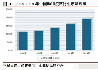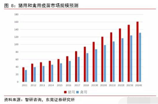 獸用生物制品中動物疫苗是主要種類,我國動物疫苗行業(yè)起始于1918年青島商品檢驗局血清所,經(jīng)歷了三個大的階段,分別是起步階段、粗放 發(fā)展時期和快速發(fā)展時期。近年來我國養(yǎng)殖業(yè)規(guī)?;侵饕陌l(fā)展方向,規(guī)?;酿B(yǎng)殖場對動物疫苗有剛性需求,是疫苗市場的主要推動力。2000年后,我國動物疫苗行業(yè)保持快速發(fā)展態(tài)勢,截止2018年我國動物疫苗市場規(guī)模已經(jīng)接近200億元。非洲豬瘟疫情將加速動物疫苗行業(yè)的發(fā)展,預(yù)測2019年我國動物疫苗市場規(guī)模約250億元,并將持續(xù)保持高速發(fā)展,預(yù)測到2024年市場規(guī)模有望突破500億元。
