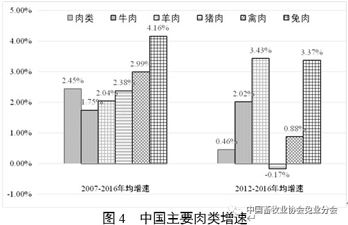 在市場需求上,隨著消費者對營養(yǎng)健康、舒適生活的追求,具有“三高、三低”特點的兔肉更加受消費者青睞。近10年間,我國兔肉產(chǎn)量年均增速達到4.16%,高于同期其他肉類(均在3%以內(nèi))。近五年內(nèi),在肉類整體增長放緩的時期,兔肉產(chǎn)量年均增速達3.37%,仍處于較高水平(圖4)。