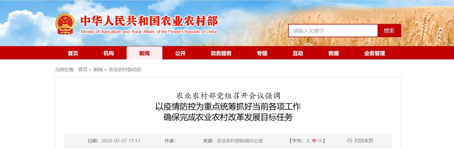 2月7日,農(nóng)業(yè)農(nóng)村部黨組書記、部長(zhǎng)韓長(zhǎng)賦主持召開黨組會(huì)議,傳達(dá)學(xué)習(xí)習(xí)近平總書記在中央政治局常委會(huì)會(huì)議研究應(yīng)對(duì)新型冠狀病毒感染肺炎疫情工作時(shí)的重要講話精神、國(guó)務(wù)院常務(wù)會(huì)議研究支持新型冠狀病毒感染肺炎疫情防控有關(guān)工作精神,進(jìn)一步研究貫徹落實(shí)工作。會(huì)議強(qiáng)調(diào),要全面系統(tǒng)、深入學(xué)習(xí)領(lǐng)會(huì)習(xí)近平總書記重要講話精神,堅(jiān)決貫徹黨中央、國(guó)務(wù)院決策部署,進(jìn)一步增強(qiáng)“四個(gè)意識(shí)”、堅(jiān)定“四個(gè)自信”、做到“兩個(gè)維護(hù)”,不斷深化對(duì)做好疫情防控工作重要性緊迫性的認(rèn)識(shí),堅(jiān)決打贏疫情防控阻擊戰(zhàn),統(tǒng)籌抓好當(dāng)前“三農(nóng)”重點(diǎn)工作,確保完成農(nóng)業(yè)農(nóng)村改革發(fā)展目標(biāo)任務(wù)。