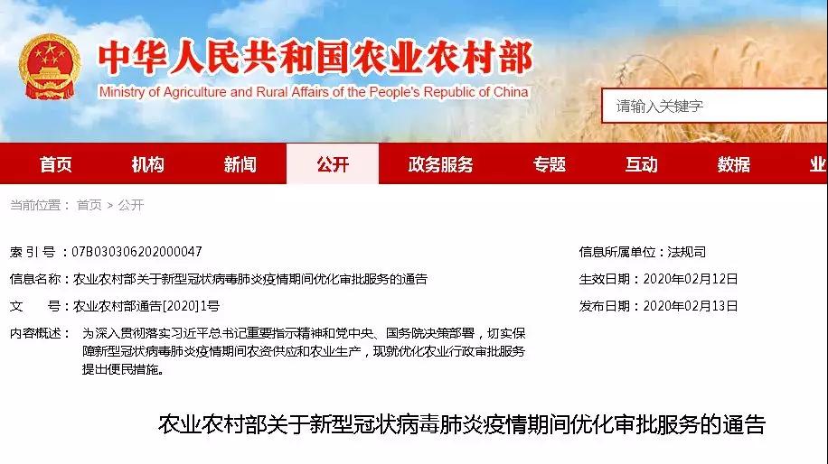 2月13日,農(nóng)業(yè)農(nóng)村部官網(wǎng)發(fā)布《關于新型冠狀病毒肺炎疫情期間優(yōu)化審批服務的通告》?!锻ǜ妗繁硎?,在新冠病毒肺炎疫情期間,農(nóng)業(yè)農(nóng)村部優(yōu)化農(nóng)業(yè)行政審批服務,提出多項便民措施。包括對獸用消毒劑類產(chǎn)品批準文號申請實行優(yōu)先審批,即報即辦等。