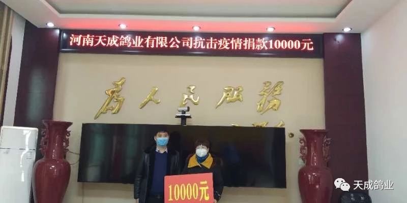 2月8日,河南天成鴿業(yè)有限公司總經(jīng)理李玉霞又將10000元的抗擊疫情專項資金,捐贈到舞鋼市棗林鎮(zhèn)政府,為抗擊疫情再出一份力。