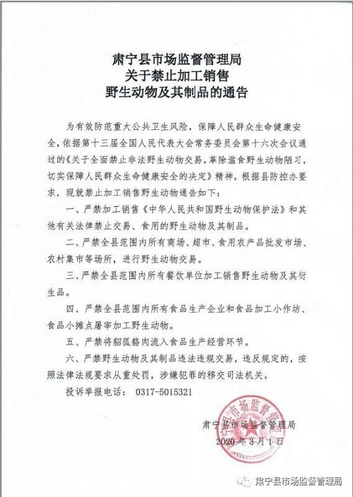 肅寧縣關(guān)于禁止加工銷售野生動(dòng)物及其制品的通告