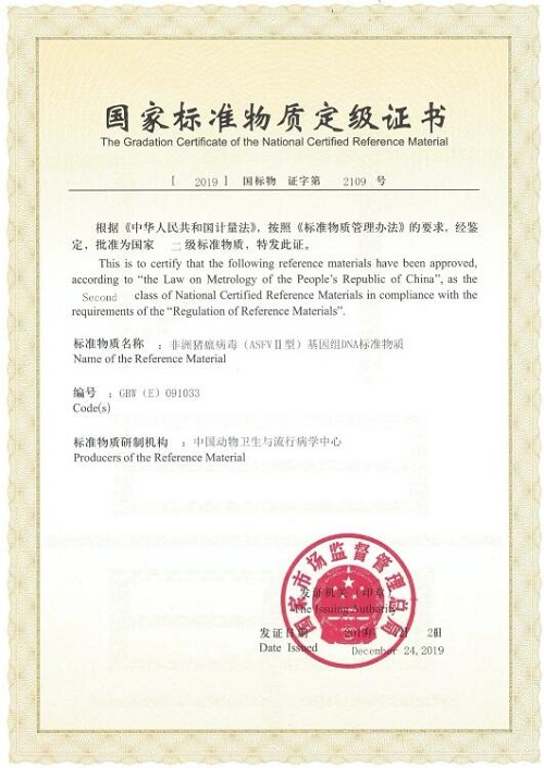 中國動物衛(wèi)生與流行病學(xué)中心研制的“非洲豬瘟病毒(ASFVⅡ型)基因組DNA標(biāo)準(zhǔn)物質(zhì)”獲得國家標(biāo)準(zhǔn)物質(zhì)定級證書
