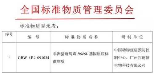 中國獸醫(yī)網(wǎng)消息,由中國動物疫病預(yù)防控制中心,國家/OIE豬繁殖與呼吸綜合征參考實驗室研發(fā)的非洲豬瘟病毒B646L基因質(zhì)粒標(biāo)準(zhǔn)物質(zhì),2019年9月17日通過國家二級標(biāo)準(zhǔn)物質(zhì)評審,獲得標(biāo)準(zhǔn)物質(zhì)編號GBW(E)091034。