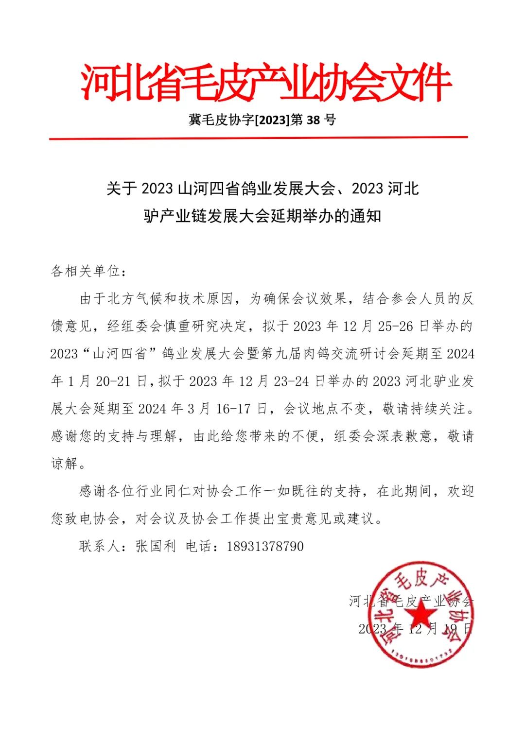 關(guān)于2023山河四省鴿業(yè)發(fā)展大會、2023河北驢產(chǎn)業(yè)鏈發(fā)展大會延期舉辦的通知