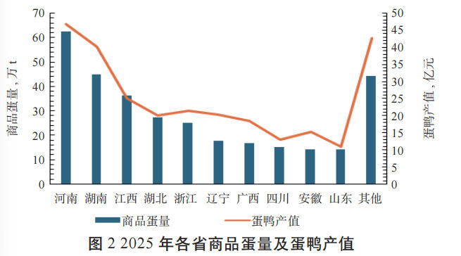 圖2反映了2025年我國23個(gè)蛋鴨主產(chǎn)省的商品蛋量和蛋鴨產(chǎn)值。就區(qū)域生產(chǎn)布局而言,生產(chǎn)主要集中在華中、華東地區(qū),其產(chǎn)蛋量和產(chǎn)值分別占全國的81.5%和67.97%。就省域分布而言,蛋鴨生產(chǎn)分布較為均衡,未出現(xiàn)單一省份獨(dú)占鰲頭的現(xiàn)象。