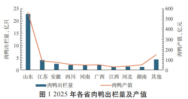 圖1反映了2025年我國23個(gè)肉鴨主產(chǎn)省的肉鴨出欄量和產(chǎn)值。就區(qū)域生產(chǎn)布局而言,肉鴨產(chǎn)業(yè)的生產(chǎn)區(qū)域集中度較高,華東地區(qū)出欄量高達(dá)28.09億只,占全國的71.91%。省域分布而言,山東在出欄量和產(chǎn)值上均居首位,分別是江蘇的5.7倍與6.5倍。分品種來看,白羽肉鴨占主導(dǎo)(84.83%),番鴨與半番鴨占5.06%,其他品種合計(jì)占10.11%。其中,山東以白羽肉鴨為主,吉林、福建和廣東則是番鴨、半番鴨養(yǎng)殖最集中的省份。