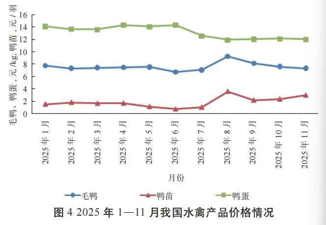 2025年以來,水禽產(chǎn)品價(jià)格運(yùn)行相對(duì)平穩(wěn),但價(jià)格中樞較2024年明顯下移,反映出行業(yè)景氣度走弱。毛鴨和鴨蛋價(jià)格年末均低于年初,鴨苗價(jià)格雖在低位后出現(xiàn)階段性回升(圖4),但整體水平仍顯著低于上年同期,表明在終端消費(fèi)恢復(fù)乏力、階段性供給偏寬的背景下,水禽產(chǎn)業(yè)整體仍處于承壓狀態(tài),養(yǎng)殖端盈利空間持續(xù)收縮。