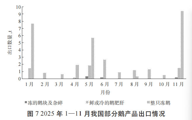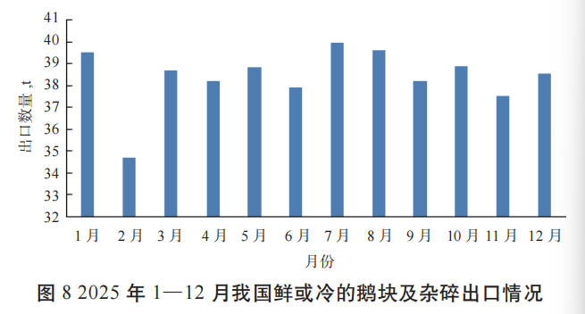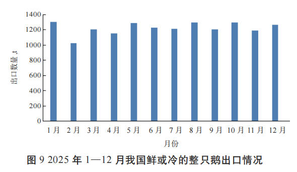 相較于鴨產(chǎn)品,鵝產(chǎn)品在2025年的出口表現(xiàn)相對(duì)承壓(圖7~9)。整只凍鵝出口量、出口額分別同比增長10.57%和9.31%,但鮮或冷的整只鵝出口量同比增長1.08%,出口額同比下降7.51%,凍鵝塊及雜碎出口量、出口額大幅下滑67.39%和68.49%。鮮或冷的鵝肥肝出口量增長75.64%,但受單價(jià)下降影響,出口額增幅有限。盡管部分品類在出口數(shù)量上實(shí)現(xiàn)小幅增長,但整體出口額出現(xiàn)回落,反映出鵝產(chǎn)品在國際市場中面臨更為嚴(yán)峻的價(jià)格約束與需求波動(dòng),尤其是中低端鵝產(chǎn)品受國際競爭加劇和替代品沖擊影響較大,而高端鵝產(chǎn)品雖然具備一定增長潛力,但對(duì)價(jià)格波動(dòng)高度敏感,出口表現(xiàn)呈現(xiàn)出明顯的不穩(wěn)定性,進(jìn)一步凸顯出不同水禽品類在全球價(jià)值鏈中的分化定位。