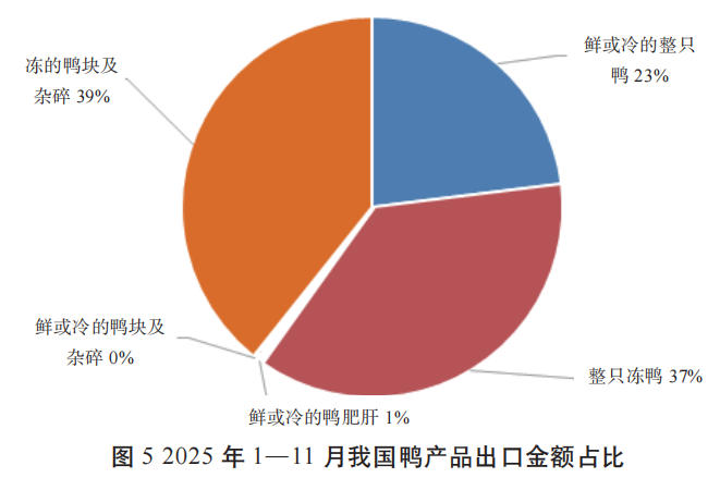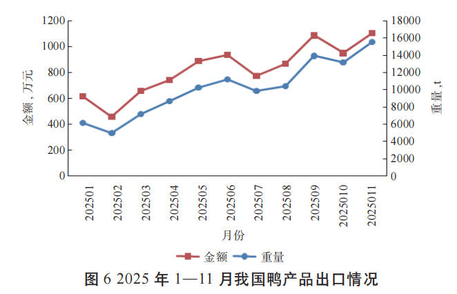 2025年1—11月,我國鴨產(chǎn)品出口呈現(xiàn)“數(shù)量快速增長、金額穩(wěn)步提升”的特征,其中凍制鴨產(chǎn)品及副產(chǎn)品成為增長核心驅(qū)動(dòng)力。這表明國際市場對(duì)標(biāo)準(zhǔn)化、易儲(chǔ)運(yùn)水禽制品的需求持續(xù)增強(qiáng),我國在規(guī)?;a(chǎn)與加工環(huán)節(jié)的比較優(yōu)勢正逐步釋放。