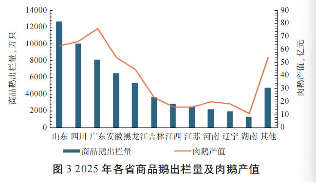 圖3反映了2025年我國23個(gè)肉鵝主產(chǎn)省的商品鵝出欄量和產(chǎn)值。就區(qū)域生產(chǎn)布局而言,華東地區(qū)出欄量居首位,約2.47億只,占全國的40.12%;華南地區(qū)雖出欄量僅為全國第4位,但憑借價(jià)格優(yōu)勢,總產(chǎn)值位居全國第2位。就省域分布而言,生產(chǎn)主要集中在山東、四川、廣東和安徽,4省總和占全國的60.46%,而廣東因價(jià)格優(yōu)勢,產(chǎn)值超過山東,位列全國第1位。
