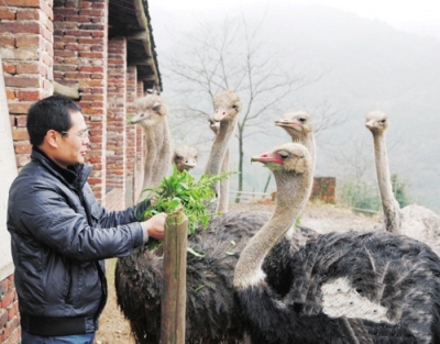 安福縣山莊鄉(xiāng)荷溪村伍建明、李輝明兩村民,2013年5月回到家鄉(xiāng),在鄉(xiāng)民政所的大力幫助下,籌措資金30萬元合伙創(chuàng)辦了鴕鳥繁育物種基地。如今該基地有澳洲鴕鳥、非洲鴕鳥30只,并