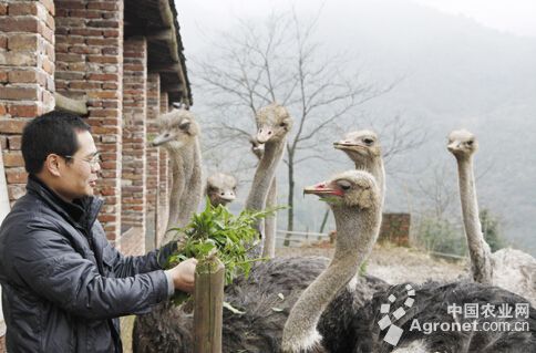 1月7日,資興市回龍山鴕鳥養(yǎng)殖基地,養(yǎng)殖戶黃永輝正在給鴕鳥喂食鮮草。黃永輝在該市承包百畝荒山養(yǎng)殖鴕鳥,年出欄商品鴕鳥近100頭,鴕鳥肉、鴕鳥蛋及鴕鳥蛋工藝品供不應求。近
