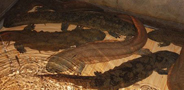 圖為:沐川縣馬邊河大鯢養(yǎng)殖專業(yè)合作社的大鯢?! ?月25日,筆者來到樂山沐川縣武圣鄉(xiāng)草坪村5組養(yǎng)殖戶李百權的大鯢繁養(yǎng)場,一股涼意撲面而來,一條條憨態(tài)可掬的大鯢正在二十幾