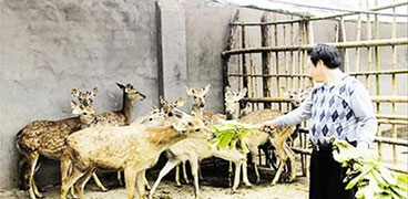 圖為:鄭想林在喂養(yǎng)梅花鹿?! M目盡蒼翠,綠水繞村郭?! ?日,在天門拖市鎮(zhèn)陳云村養(yǎng)殖戶鄭想林的特種養(yǎng)殖基地,圈養(yǎng)的梅花鹿不時呦呦鳴叫,幾頭鹿崽躲在媽媽的身后,探出頭向