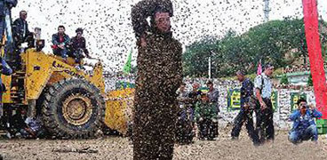 榆林市子洲縣的養(yǎng)蜂人張偉,能讓重達(dá)83.5公斤(約2萬(wàn)只)的蜜蜂附在自己身上。他于2011年5月27日打破此前保持了六年的世界紀(jì)錄,被授予“世界蜂王”的稱號(hào)。昨日(9