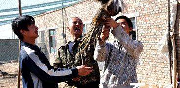 5月9日,一只藍孔雀在三個年輕人的手上展翅欲飛。這三個年輕人分別是康明(左一)、田榮杰(中)和馮強(右一),這只藍孔雀正是他們在奇臺縣老奇臺鎮(zhèn)一個土山梁上辦的珍禽養(yǎng)殖場
