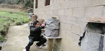 【導(dǎo)語(yǔ)·中國(guó)特種養(yǎng)殖網(wǎng)】石柱縣鴻菊蜂蜜專業(yè)合作社蜂農(nóng) 給蜜蜂桶裹上舊棉衣,以達(dá)到保溫效果。蜜蜂安全越冬是奪取來(lái)年蜂蜜高產(chǎn)的基礎(chǔ),如果防寒保暖措施不好,蜜蜂一