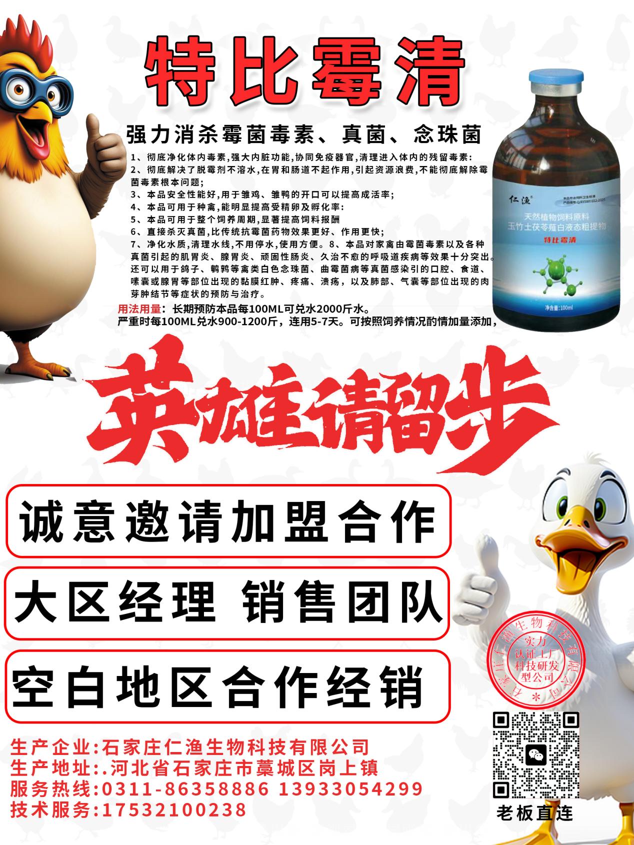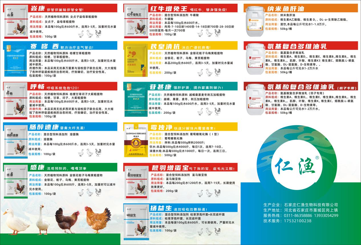 石家莊仁漁生物科技有限公司,地址位于中國(guó)藥都——石家莊市,是一家專業(yè)從事動(dòng)物保健品行業(yè)的高新科技企業(yè),占地六千余平方米。是一家集生產(chǎn)、經(jīng)營(yíng)、研發(fā)服務(wù)為一體的股份制科技型企業(yè)。早在2004年就一直從事動(dòng)物保健品行業(yè),于2015年成立本公司。2016年建立企業(yè)標(biāo)準(zhǔn)化生產(chǎn)制度,2018年取得環(huán)境影響報(bào)告書(shū),建立現(xiàn)代化企業(yè)保護(hù)環(huán)境的責(zé)任心,2022年02月22日取得混合型飼料添加劑生產(chǎn)許可證、液態(tài)飼料添加劑生產(chǎn)許可證(證號(hào):冀飼添(2022)H01108)。