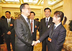昨日,溫家寶參加十一屆全國(guó)人大一次會(huì)議廣東代表團(tuán)審議,與來(lái)自廣東佛山的農(nóng)民工代表胡小燕(右)握手。雷聲攝