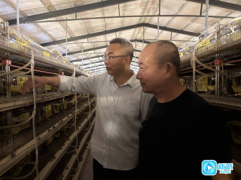 付興鵬(左)和工作人員查看鵪鶉生長情況。