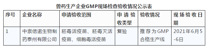 根據(jù)《獸藥生產(chǎn)質(zhì)量管理規(guī)范》的規(guī)定,依照《獸藥生產(chǎn)質(zhì)量管理規(guī)范檢查驗收辦法》,省農(nóng)業(yè)農(nóng)村廳派出的專家組對中崇信諾生物制藥泰州有限公司實施獸藥GMP的情況進行了現(xiàn)場檢查驗收。根據(jù)現(xiàn)場驗收和技術資料審核意見,企業(yè)近日報送了GMP整改情況和補正材料,專家組形成了獸藥GMP整改情況審核意見。現(xiàn)將檢查情況在江蘇省農(nóng)業(yè)農(nóng)村廳官網(wǎng)上予以公示,公示時間為2021年6月29日至2021年7月5日,如有意見和建議,請反饋至江蘇省農(nóng)業(yè)農(nóng)村廳獸醫(yī)局。
