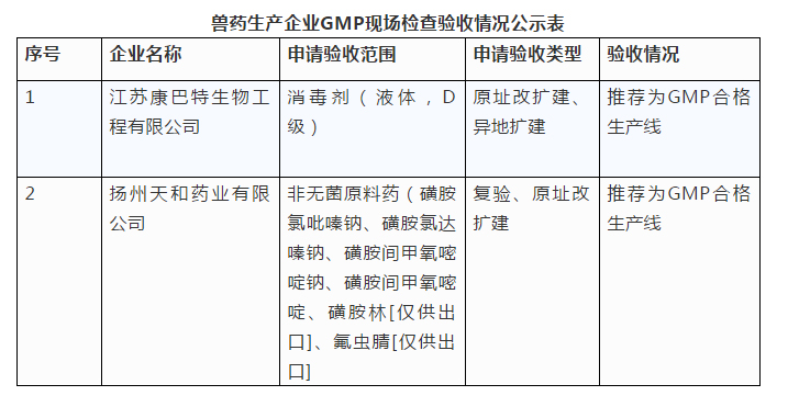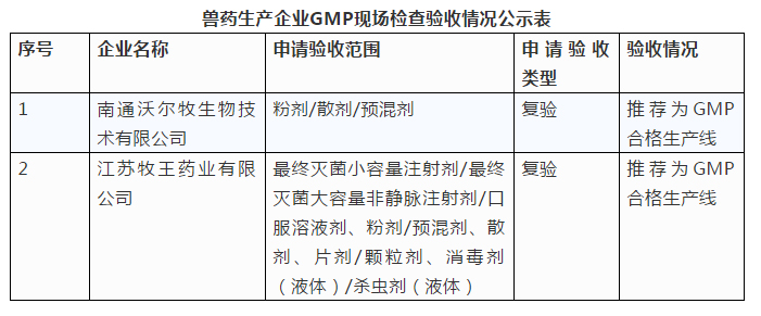 第9批獸藥生產(chǎn)企業(yè)GMP檢查驗收情況公示