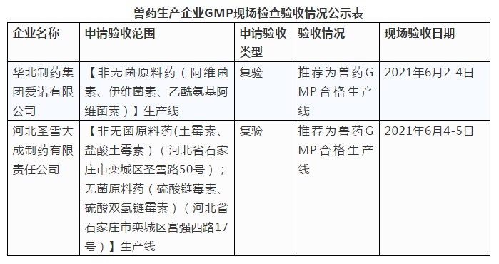 根據(jù)《獸藥生產(chǎn)質(zhì)量管理規(guī)范(2020年修訂)》和《獸藥生產(chǎn)質(zhì)量管理規(guī)范檢查驗收辦法》,河北省農(nóng)業(yè)農(nóng)村廳派出專家組對華北制藥集團愛諾有限公司【非無菌原料藥(阿維菌素、伊維菌素、乙酰氨基阿維菌素)】(復驗)、河北圣雪大成制藥有限責任公司【非無菌原料藥(土霉素、鹽酸土霉素)(河北省石家莊市欒城區(qū)圣雪路50號);無菌原料藥(硫酸鏈霉素、硫酸雙氫鏈霉素)(河北省石家莊市欒城區(qū)富強西路17號)】(復驗)生產(chǎn)線生產(chǎn)線實施新版獸藥GMP情況進行了現(xiàn)場檢查驗收?,F(xiàn)將檢查結果在河北省農(nóng)業(yè)農(nóng)村廳網(wǎng)站予以公示,公示時間為2021年6月7日至2021年6月21日,請將意見和建議反饋河北省農(nóng)業(yè)農(nóng)村廳畜禽屠宰與獸藥飼料管理處。