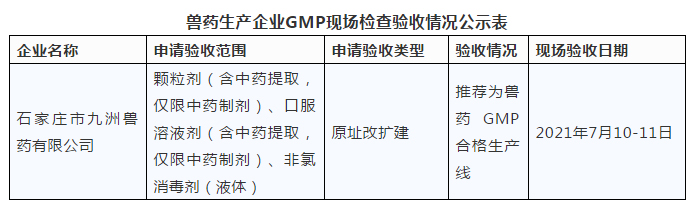 根據(jù)《獸藥生產(chǎn)質(zhì)量管理規(guī)范(2020年修訂)》和《獸藥生產(chǎn)質(zhì)量管理規(guī)范檢查驗收辦法》,河北省農(nóng)業(yè)農(nóng)村廳派出專家組對石家莊市九洲獸藥有限公司實施新版獸藥GMP情況進行了現(xiàn)場檢查驗收。現(xiàn)將檢查結果在河北省農(nóng)業(yè)農(nóng)村廳網(wǎng)站予以公示,公示時間為2021年7月12日至2021年7月26日,請將意見和建議反饋河北省農(nóng)業(yè)農(nóng)村廳畜禽屠宰與獸藥飼料管理處。