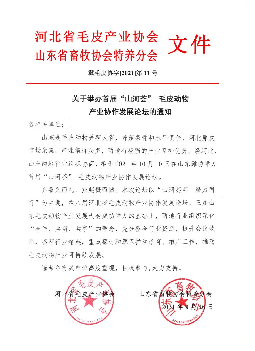 山東是毛皮動物養(yǎng)殖大省,養(yǎng)殖條件和水平俱佳,河北原皮市場聚集,產(chǎn)業(yè)集群眾多,兩地有極強的產(chǎn)業(yè)互補優(yōu)勢。經(jīng)河北、山東兩地行業(yè)組織協(xié)商,擬于2021年10月10日在山東濰坊舉辦首屆“山河薈” 毛皮動物產(chǎn)業(yè)協(xié)作發(fā)展論壇。