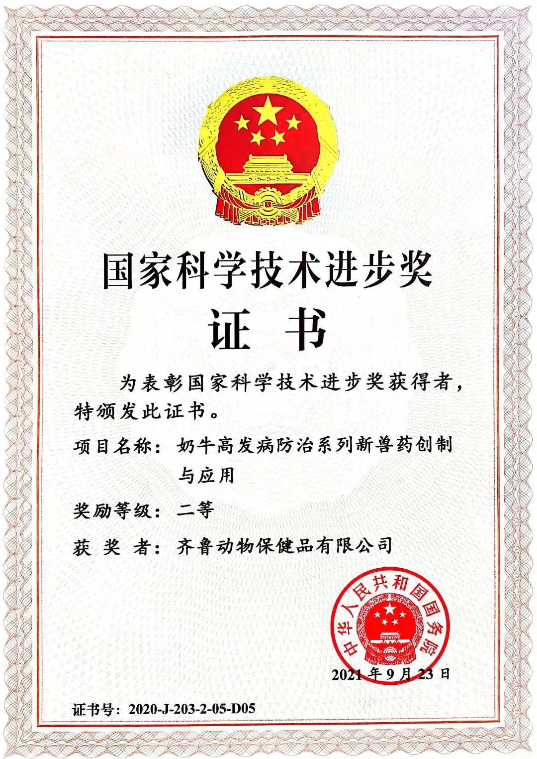 恭賀!齊魯動物保健品有限公司再獲2項國家科學(xué)技術(shù)獎!