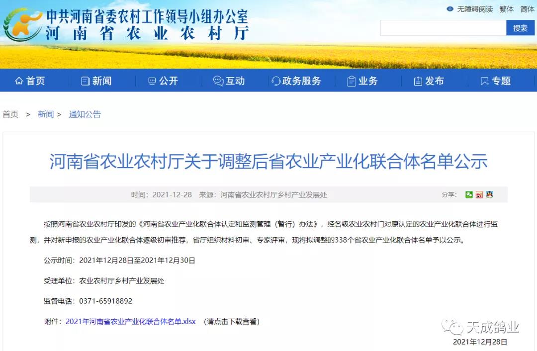 喜訊!天成鴿業(yè)獲評河南省農(nóng)業(yè)產(chǎn)業(yè)化聯(lián)合體