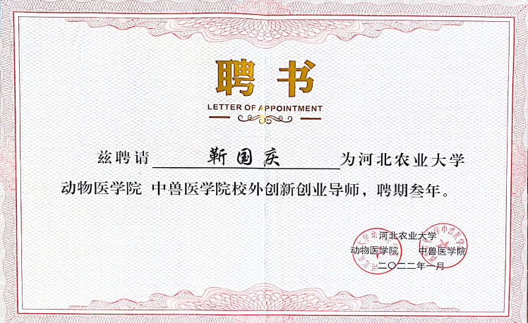 日前,河北農(nóng)業(yè)大學(xué)動(dòng)物醫(yī)學(xué)院、中獸醫(yī)學(xué)院聘請(qǐng)靳國(guó)慶為“校外創(chuàng)新創(chuàng)業(yè)導(dǎo)師”,并頒發(fā)證書,聘期為三年。