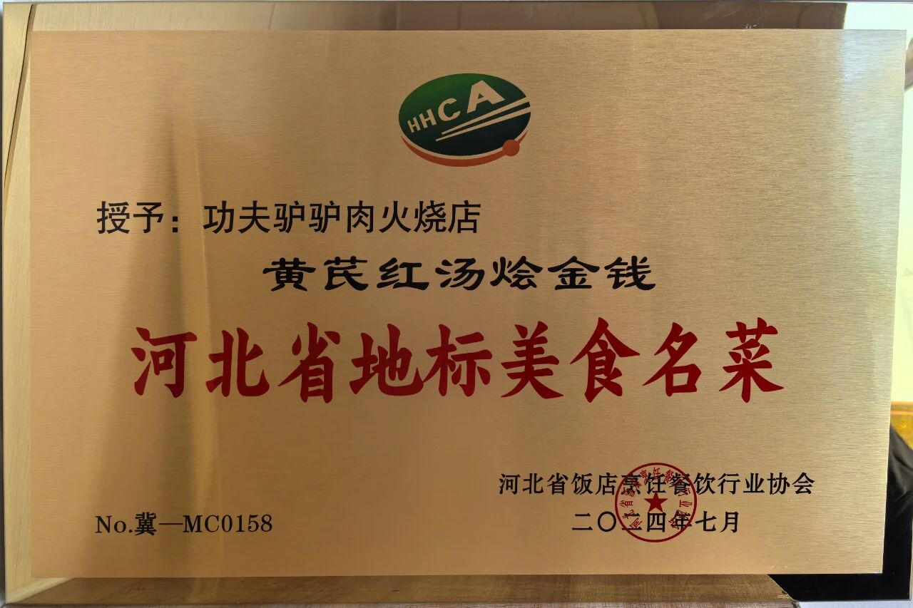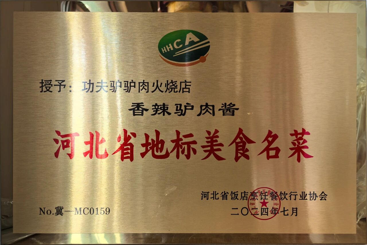 2024年,功夫驢驢肉火燒入選首批“河北省地標(biāo)美食”;“燕趙名品”;“滄州手信”。功夫驢全驢宴被評(píng)為河北地標(biāo)名宴,功夫驢黃芪紅湯燴金錢、功夫驢驢肉辣醬被評(píng)為河北地標(biāo)名菜。