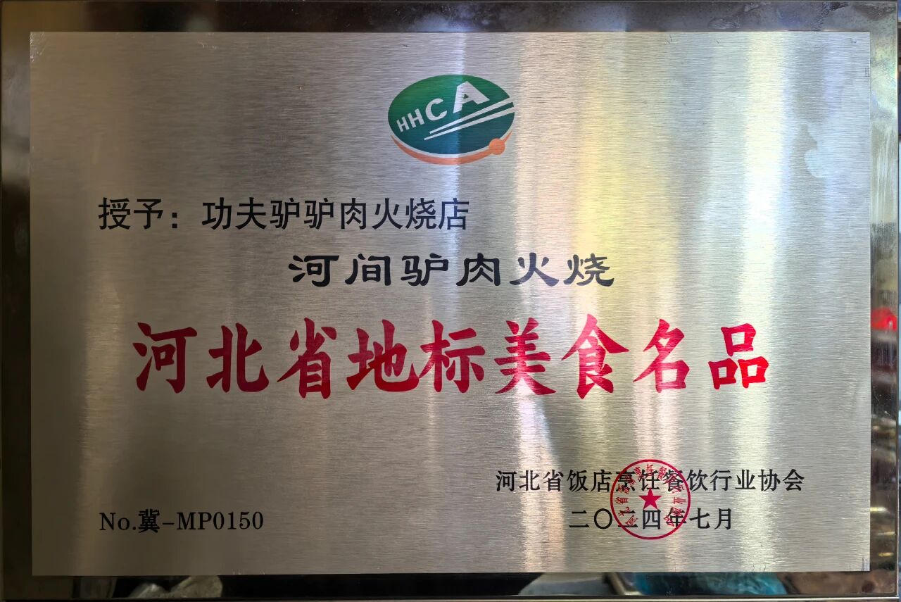 河間驢肉火燒制作技藝在2012年入選河北省非物質(zhì)文化遺產(chǎn),功夫驢傳統(tǒng)醬驢肉也于2025年入選市級(jí)非物質(zhì)文化遺產(chǎn)。功夫驢同時(shí)擁有兩個(gè)非遺的制作技藝,成為地方飲食文化的 “活化石”。