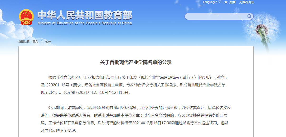 關(guān)于首批現(xiàn)代產(chǎn)業(yè)學(xué)院名單的公示 根據(jù)《教育部辦公廳 工業(yè)和信息化部辦公廳關(guān)于印發(fā)〈現(xiàn)代產(chǎn)業(yè)學(xué)院建設(shè)指南(試行)〉的通知》(教高廳函〔2020〕16號(hào))要求,經(jīng)各地各高校自