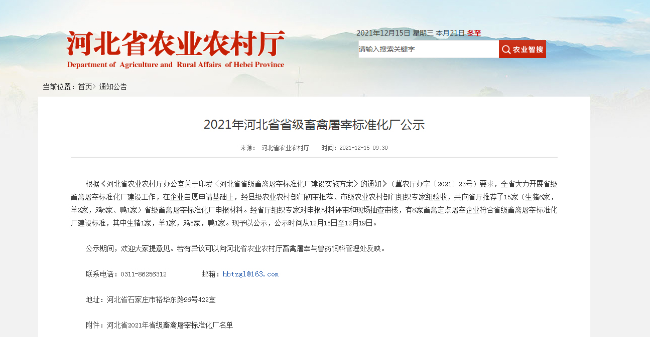 根據(jù)《河北省農(nóng)業(yè)農(nóng)村廳辦公室關(guān)于印發(fā)〈河北省省級(jí)畜禽屠宰標(biāo)準(zhǔn)化廠建設(shè)實(shí)施方案〉的通知》(冀農(nóng)廳辦字〔2021〕23號(hào))要求,全省大力開展省級(jí)畜禽屠宰標(biāo)準(zhǔn)化廠建設(shè)工作,