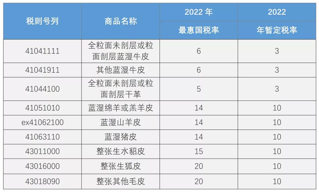 2021年12月13日,國(guó)務(wù)院關(guān)稅稅則委員會(huì)發(fā)布了《關(guān)于2022年關(guān)稅調(diào)整方案的通知》,該《通知》中關(guān)稅暫定稅率調(diào)整與皮革行業(yè)密切相關(guān)的包含41章到43章的9個(gè)稅號(hào)(見表中所列)