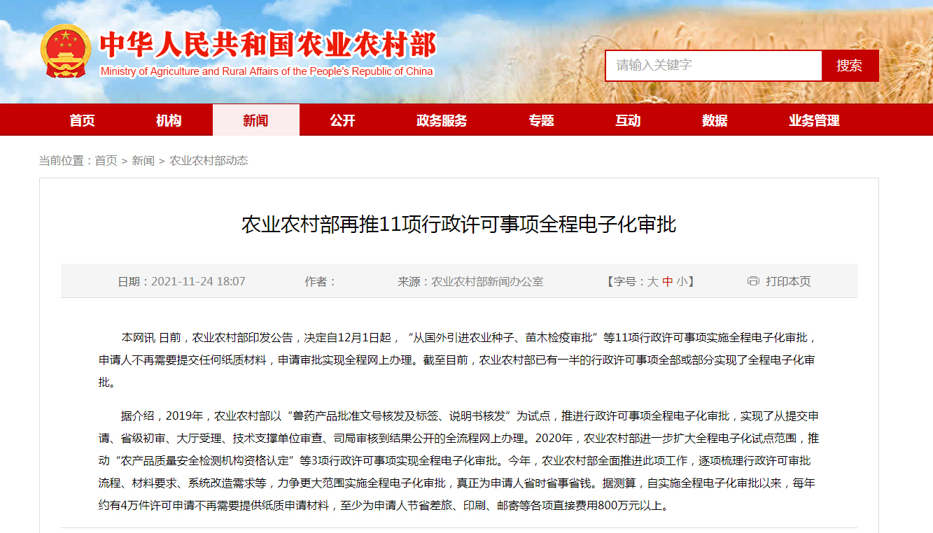 日前,農(nóng)業(yè)農(nóng)村部印發(fā)公告,決定自12月1日起,“從國外引進(jìn)農(nóng)業(yè)種子、苗木檢疫審批”等11項(xiàng)行政許可事項(xiàng)實(shí)施全程電子化審批,申請(qǐng)人不再需要提交任何紙質(zhì)材料,申請(qǐng)審