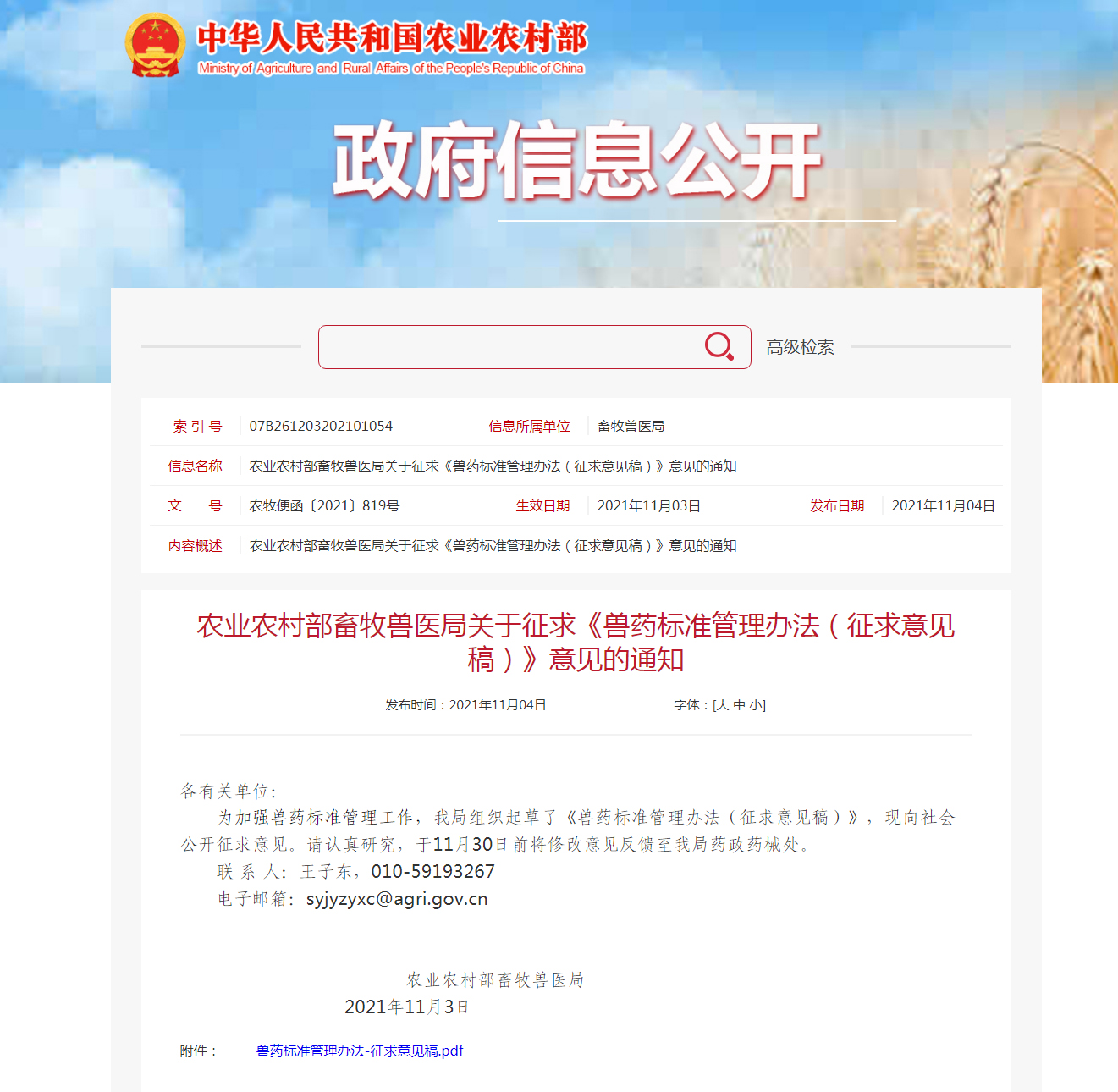 農(nóng)業(yè)農(nóng)村部畜牧獸醫(yī)局關(guān)于征求《獸藥標準管理辦法(征求意見稿)》意見的通知 各有關(guān)單位:為加強獸藥標準管理工作,我局組織起草了《獸藥標準管理辦法(征求意見稿)》,現(xiàn)向社